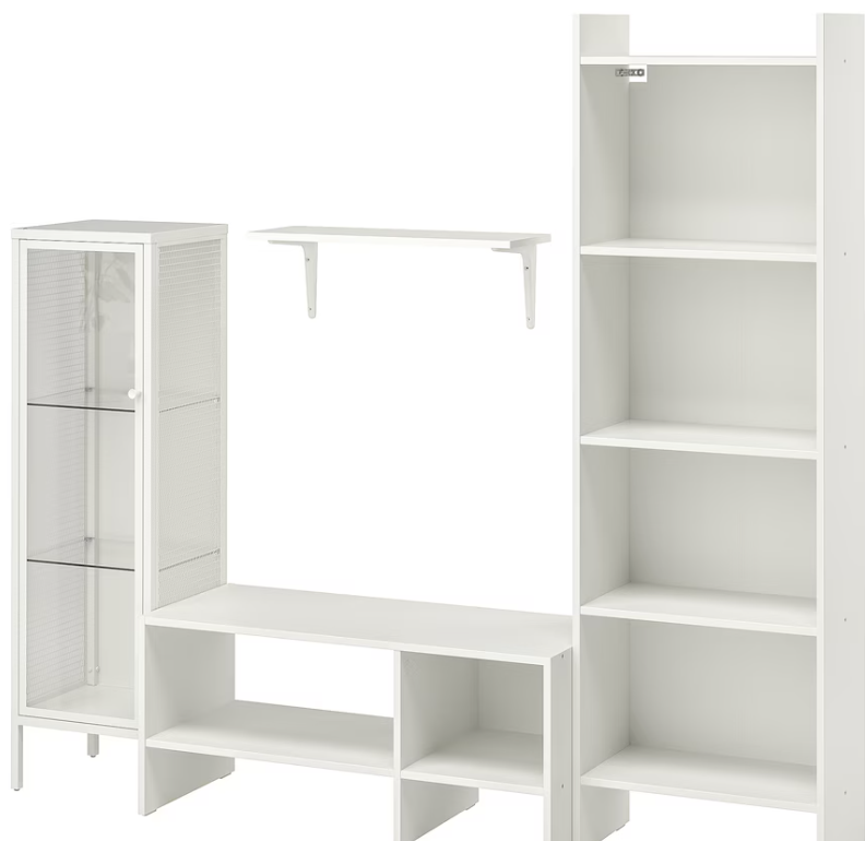 Con esta combinación lista para usarse, en rejilla, vidrio y madera, hemos hecho el trabajo por ti. Tiene una librería, una vitrina, un mueble de TV y un estante de pared, y tiene un diseño sencillo y limpio que puede colocarse donde quieras.