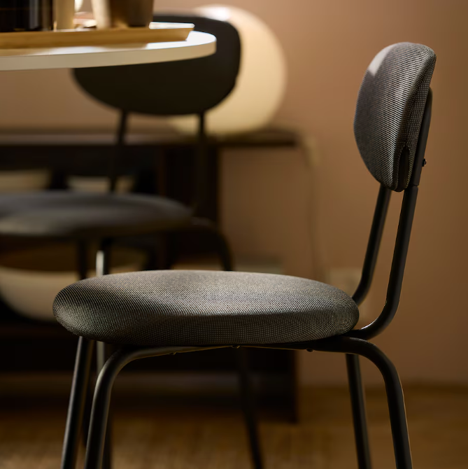 Una cómoda y resistente silla con estructura de metal, un asiento blando y un respaldo con forma curvada. Se caracteriza por un diseño sencillo y atemporal con un toque moderno que ocupa poco espacio a un precio increíble.