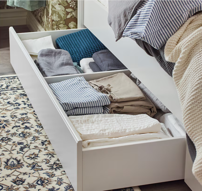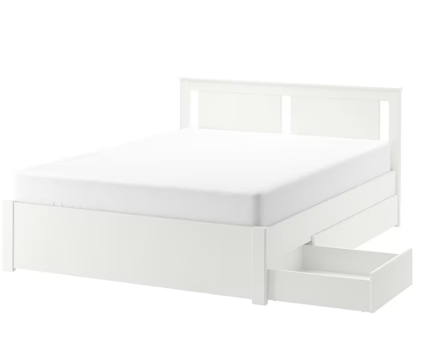 Una estructura de cama robusta con bordes redondeados y patas altas. Un estilo clásico que durará muchos años. Además, lleva unas amplias cajas de almacenaje debajo de la cama en las que puedes guardar sábanas y ropa.
